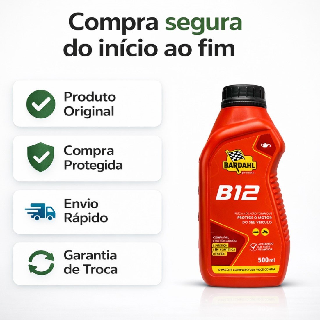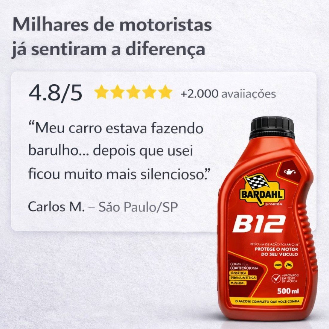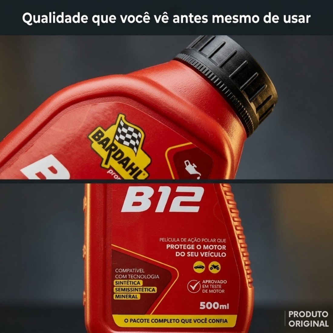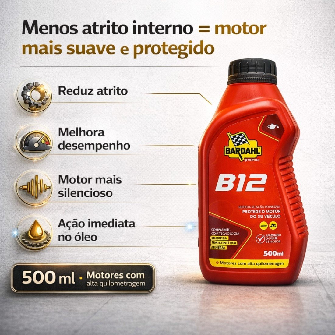 O Bardahl B12 Plus é um aditivo para óleos de motor a gasolina, etanol e GNV, podendo ser adicionado a qualquer óleo, seja de base mineral, sintético ou semissintético. Possui a exclusiva película de atração polar da Promax Bardahl, que reduz o desgaste das peças em até 70%, resistindo às mais elevadas temperaturas e pressões, permitindo uma perfeita lubrificação em todas as condições operacionais. Além disso, garante imediata redução de consumo do combustível, pois o motor consegue trabalhar de forma mais livre, sem prejudicar a lubrificação. Com isso, você também aproveitará um aumento da vida útil do seu óleo lubrificante – reduzindo o consumo dele. É possível alcançar o melhor desempenho de motores novos, cansados ou que são usados em serviços severos.